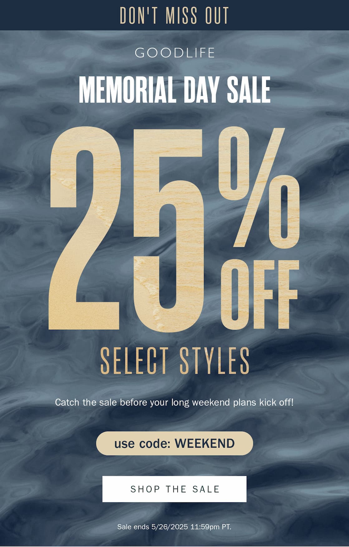 25% Off Select Styles is valid exclusively at goodlifeclothing.com until 5/26/2025 at 11:59 pm PST for
