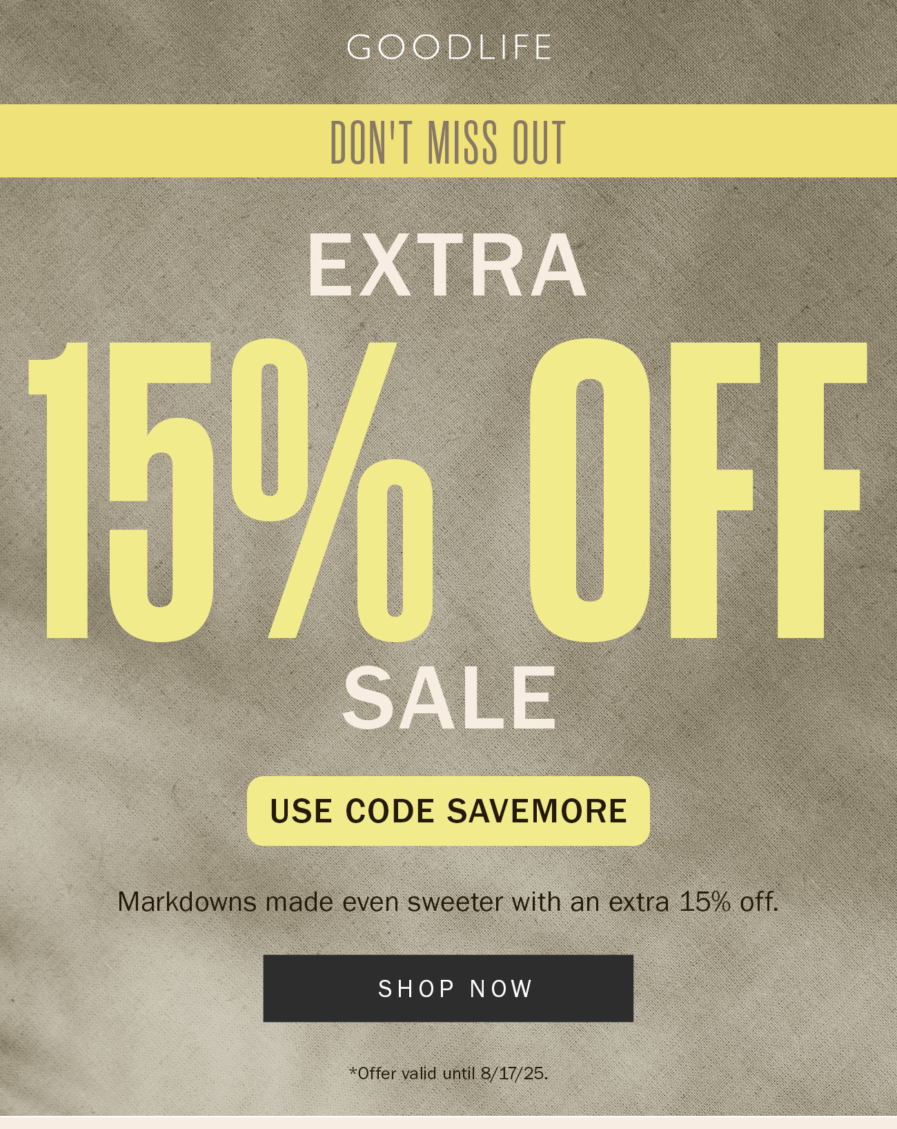 Our newest jersey fabric for holiday is a lighweight thermal fabric with a waffle texture perfect for winter layering. Extra 15% Off All Markdowns is valid until 8/17/2025 11:59 pm PT at Goodlifeclothing.com for sale styles only. Must use code SAVEMORE at checkout. Not valid on prior purchases or gift cards. Goodlife reserves the right to end or modify this offer without notice.
