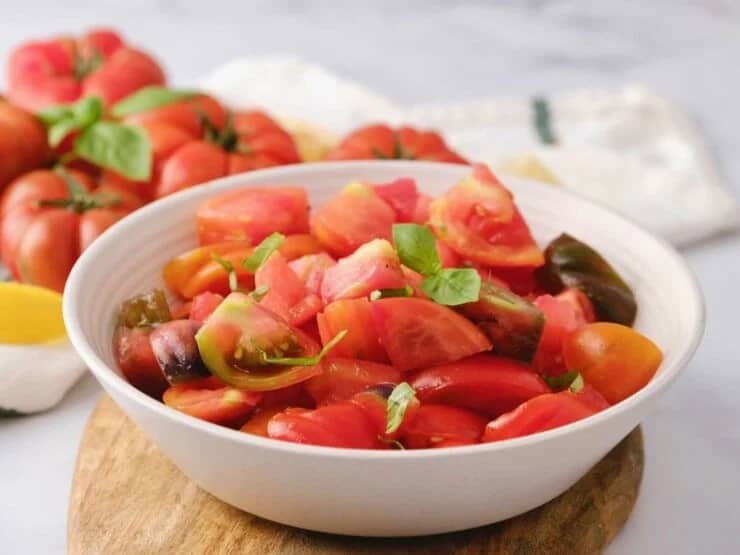 Heirloom Tomato Salad - Easy heirloom tomato salad with fragrant fresh basil, olive oil, lemon, and a touch of spice. Perfect for summer!