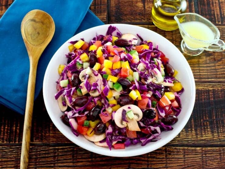 Rainbow Salad- This colorful and flavorful rainbow salad features crisp, vibrant vegetables and a blend of simple, fresh flavors. It's a versatile, healthy side dish that complements a variety of entrees. With colorful purple cabbage, tomatoes, peppers, cucumbers, and tasty olives, this salad is a feast for the eyes as well as the mouth! This rainbow salad salad should be on your regular menu rotation, and it's super easy to make.