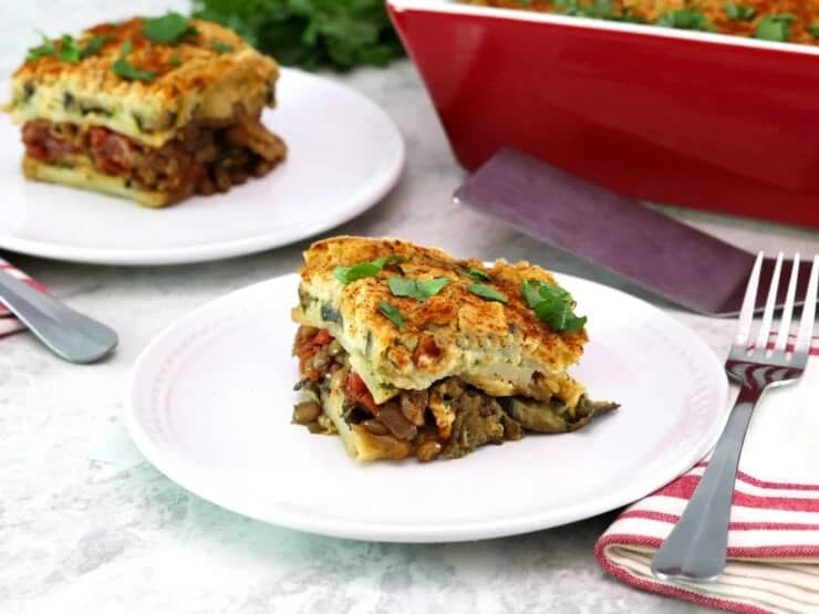 Vegan Moussaka: For a special occasion, this vegan moussaka is the ultimate hearty meatless entree. Free of meat and dairy yet full of flavor, it features layers of roasted vegetables, a lentil-mushroom filling, and a delectable baked hummus topping. No processed meat substitutes here! This all natural, healthy and flavorful casserole is sure to impress.