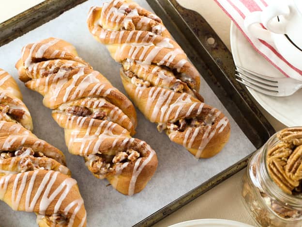 Pecan Rolls: Warm, gooey, and glazed to perfection, these Pecan Rolls are a time-tested family favorite you'll want to make again and again. They'd make a fabulous choice for Simchat Torah, where rolled and stuffed foods are traditionally eaten because they resemble the Torah scrolls. Soft yeast dough, rich pecan filling, and a sweet vanilla glaze make these rolls irresistible!
