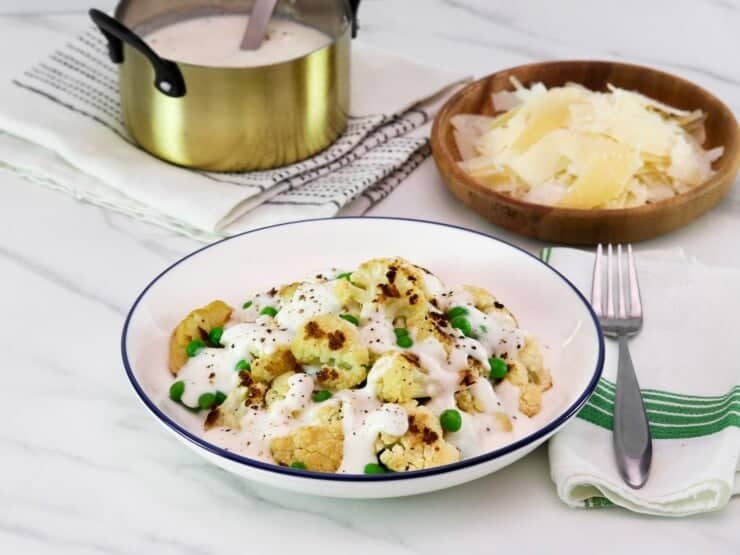 Cauliflower Alfredo with Peas: Enjoy a delicious and healthy twist on Alfredo! This creamy Greek yogurt Alfredo sauce goes perfectly with roasted cauliflower for a comforting dish that's low-carb, gluten-free, and vegetarian.