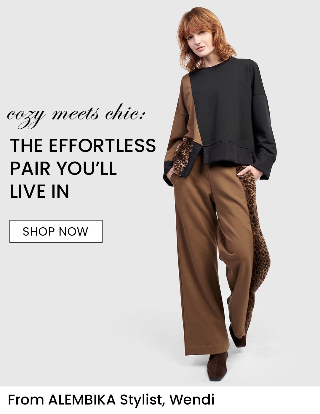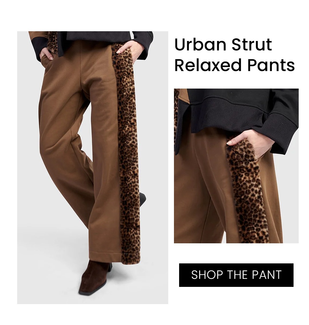 When comfort and polish come together, it's absolute magic. One of my favorite examples is the Urban Strut Relaxed Pants in Camel and Urban Lair Crewneck Top. Both are crafted in soft, seasonless French terry with plush faux fur accents—offering the ease of loungewear with the sophistication of everyday wear. What makes them special is their versatility. The boxy crewneck top drapes beautifully with drop shoulders and an asymmetrical hem that feels relaxed yet refined. The camel-toned pants feature a straight-leg silhouette and pull-on waistband that move with you while maintaining a tailored look. Wear them together for a coordinated, polished look—or separately to mix texture and tone. The top pairs effortlessly with black pants or jeans, while the camel pants look smart with a crisp white blouse or cozy knit. Soft, modern, and endlessly wearable—this is how comfort should look. Stylist Tip: Wear metallic loafers or chunky boots to take this set from errands to evening.