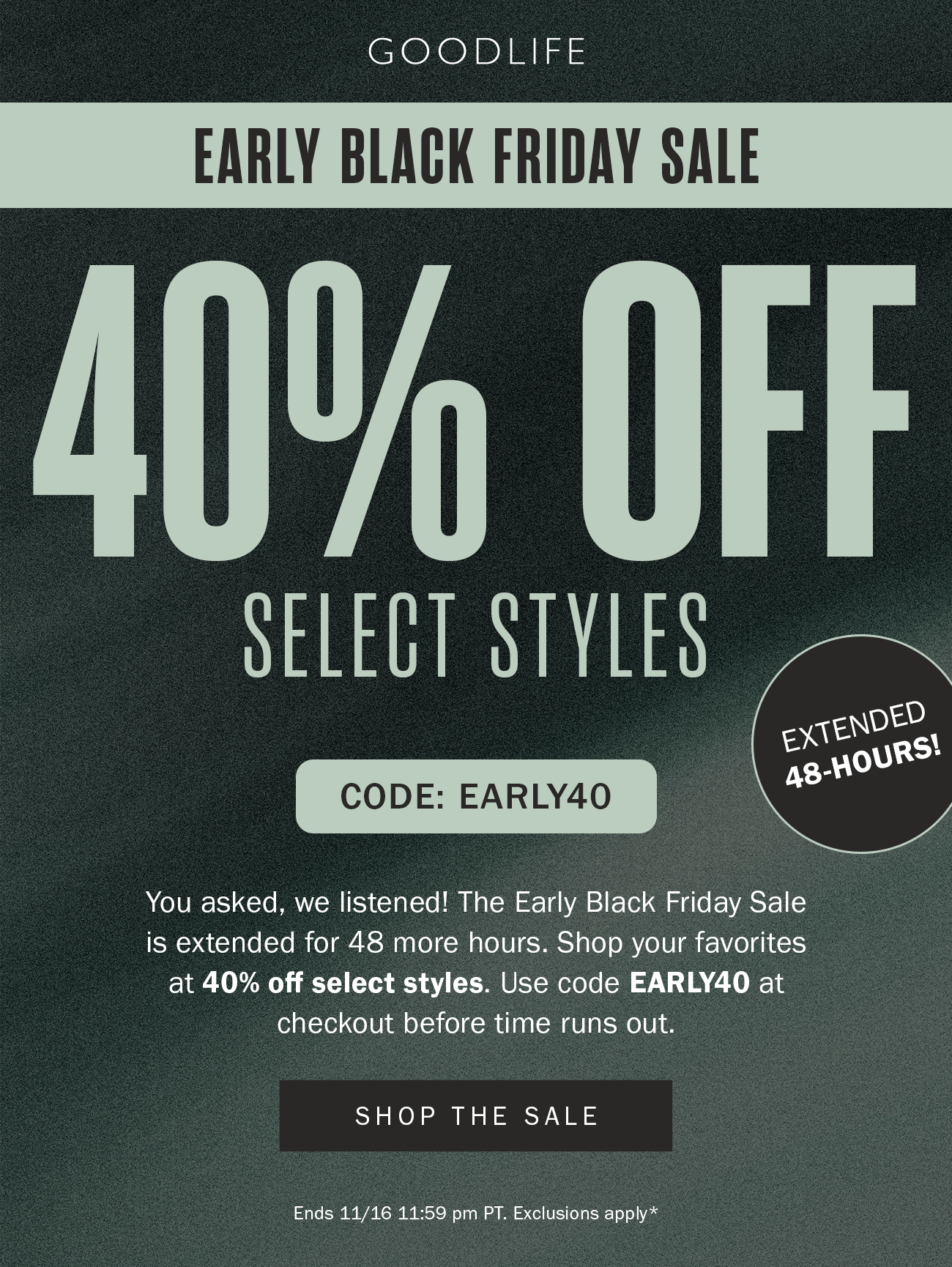 Our newest jersey fabric for holiday is a lighweight thermal fabric with a waffle texture perfect for winter layering. EXTENDED 48 Hours: Early Black Friday Sale- 40% off Select styles at Goodlifeclothing.com is valid through 11/16/2025, 11:59 PM PT. Use code EARLY40 at checkout. Excludes prior purchases and cannot be combined with other offers. Terms may change without notice. | | Our newest jersey fabric for holiday is a lighweight thermal fabric with a waffle texture perfect for winter layering. | | | | |