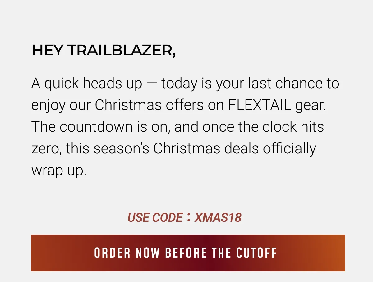 Llimited offer will be automatically applied after adding products to the cart or on the checkout page by cilcking through this mail.Discount expires at Dec 28th 15:00pm PDT. Codes cannot be combine for multiple items in some situations. Prices may not be retroactively applied to past purchases or items that are out of stock. Other exclusions may apply. | | | | 4551 Shasta Pl, El Monte, United States, 91731 | | | | | | | 2025 © FLEXTAIL All Rights Reserved | | | | | | | |