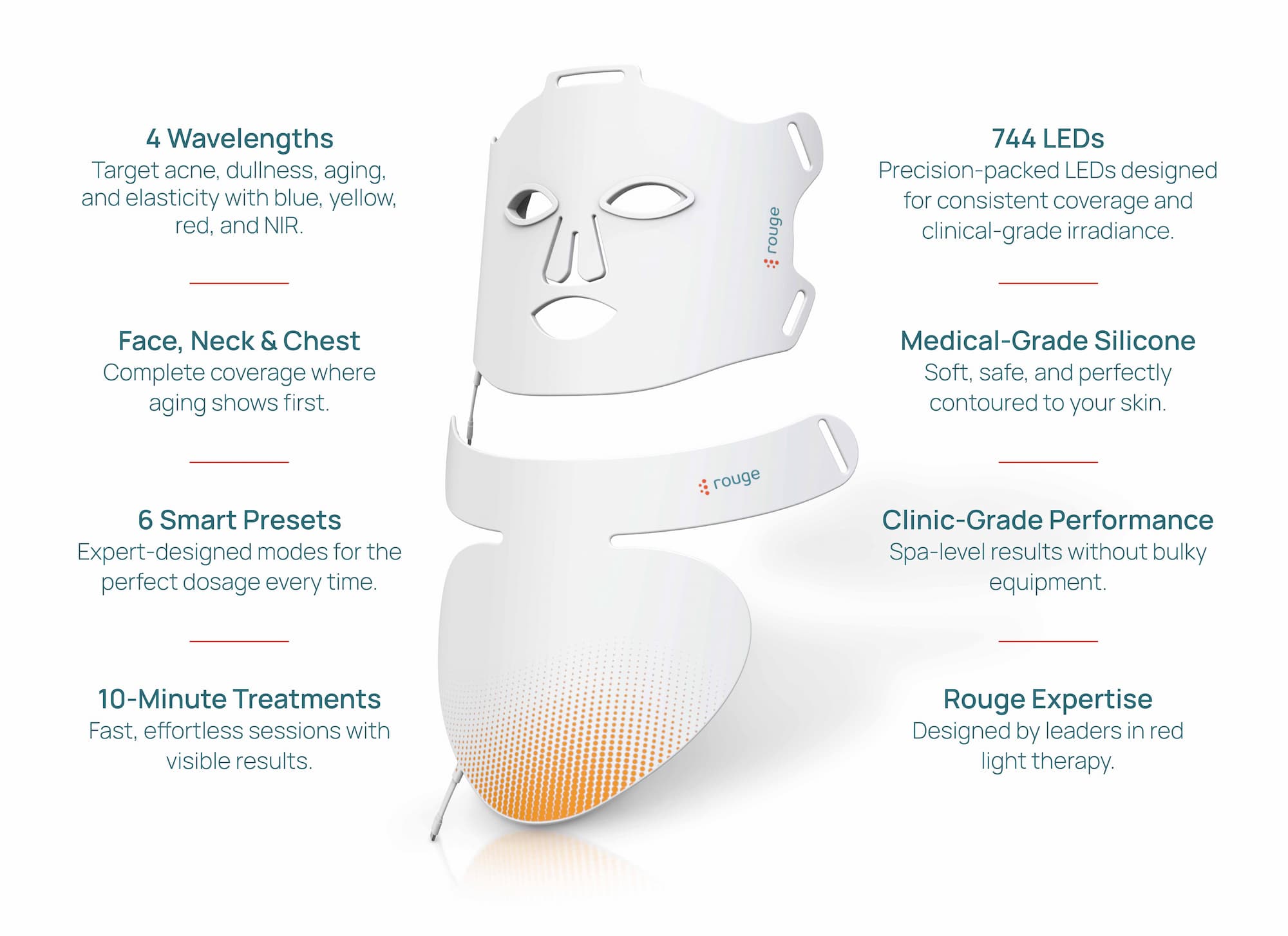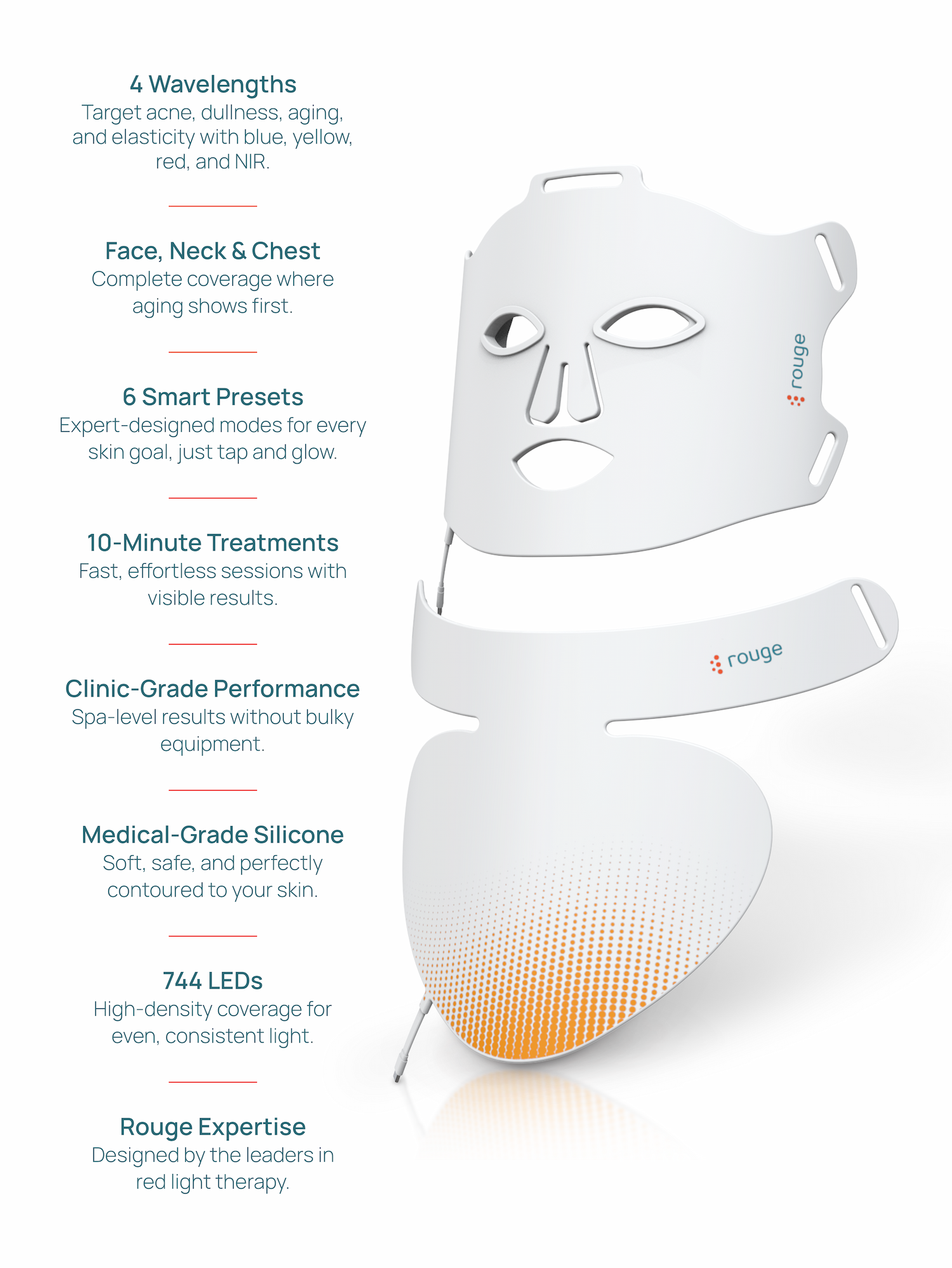 We're happy to introduce the Rouge Elite Mask. It's one of the most advanced light therapy in the world, designed for comfort and engineered for results. We've included 4 wavelengths (blue, red, near-infrared and yellow), medical-grade silicone, 744 LEDs, 6-smart presets and a neck plate attached to double the results you can get from your mask. You should demand more from your light therapy mask, and right now, enjoy 20% off during our Holiday Sale. | | Designed by the leaders in red light therapy | | Beyond comfort and aesthetics, we focused on LEDs for maximum irradiance but also smart presets with the perfect dosage needed for your goals. | | | | |